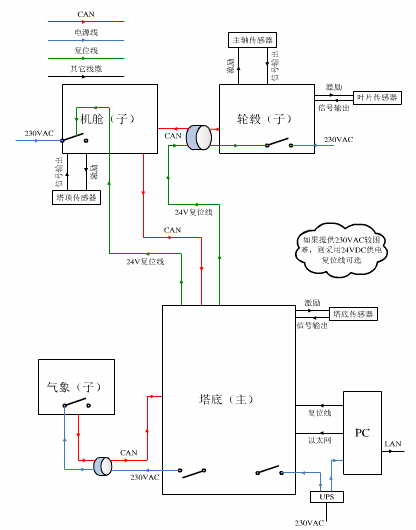 塔底放置的是德維創(chuàng)主數(shù)據(jù)采集系統(tǒng)。它與分布在風(fēng)機(jī)其他部分的子數(shù)據(jù)采集單元采用CAN總線(xiàn)方式通訊。主采集系統(tǒng)的功能包括系統(tǒng)初始化、運(yùn)行監(jiān)控、將采集數(shù)據(jù)實(shí)時(shí)存儲(chǔ)、測(cè)試數(shù)據(jù)處理等功能。